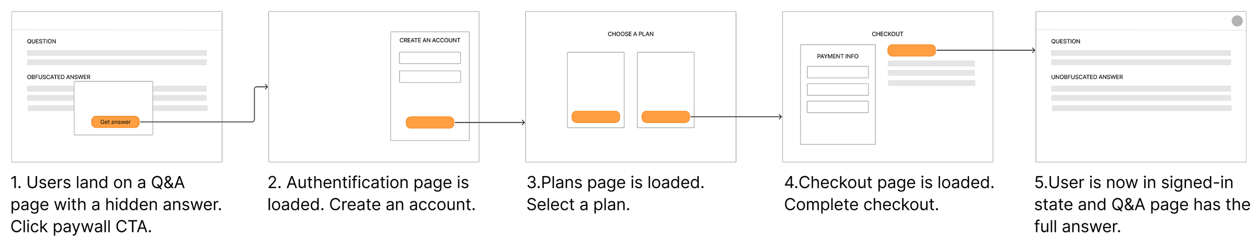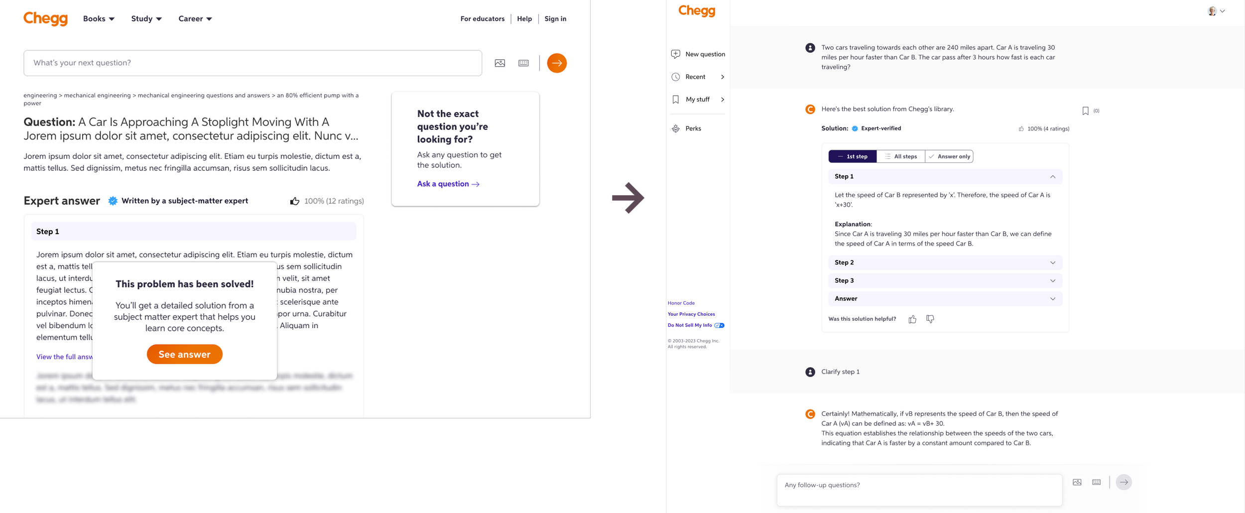 In the legacy experience, customers would arrive to a Chegg content page via Google search for a question they are trying to solve. They are presented with a paywall, and go through several steps to get to the answer that they seek, losing context as they get further away from their entry point.